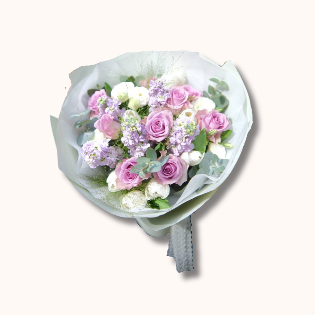 A harmonious blend of elegance and freshness with our enchanting bouquet featuring vibrant purple roses, delicate purple Matthiola, and pristine white Eustoma, lovingly wrapped in a lime green wrapper to brighten any day.