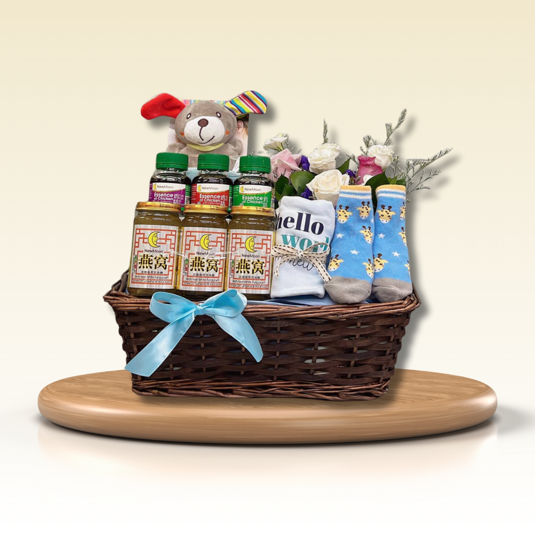 A joyful baby hamper, filled with all the essentials to welcome the newest member of the family. From cozy blanket to adorable onesies and soothing toys, this hamper is the perfect way to celebrate the arrival of your little bundle of joy and create precious memories that will last a lifetime.