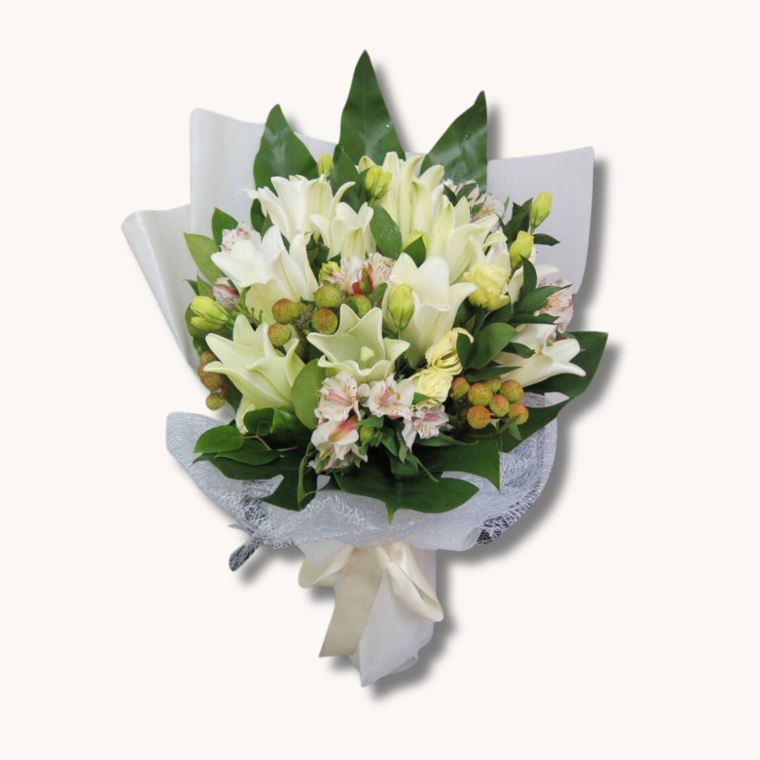 An exquisite lily bouquet, a graceful arrangement of delicate blooms that exudes timeless elegance and natural beauty, perfect for conveying heartfelt sentiments or adding a touch of sophistication to any occasion.