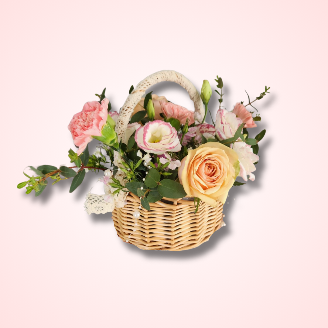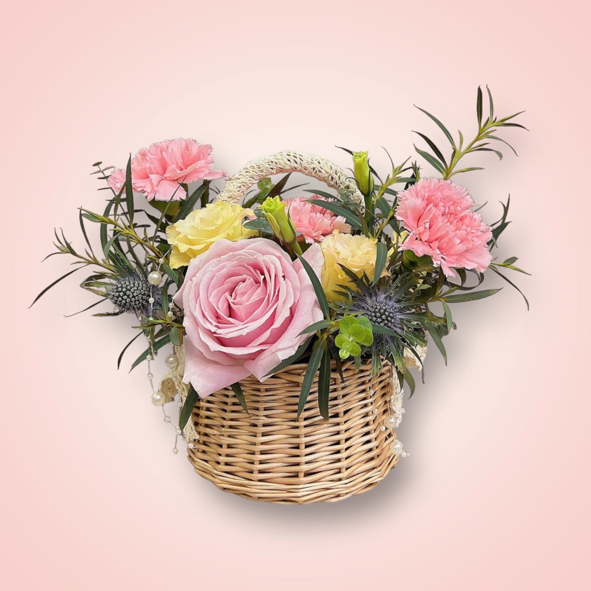 Delicate pink roses and carnations intertwine with the soft glow of yellow blooms, all nestled within a petite basket adorned with pearls. This charming arrangement exudes elegance and tenderness, a heartfelt tribute to the beauty and love embodied by mothers.