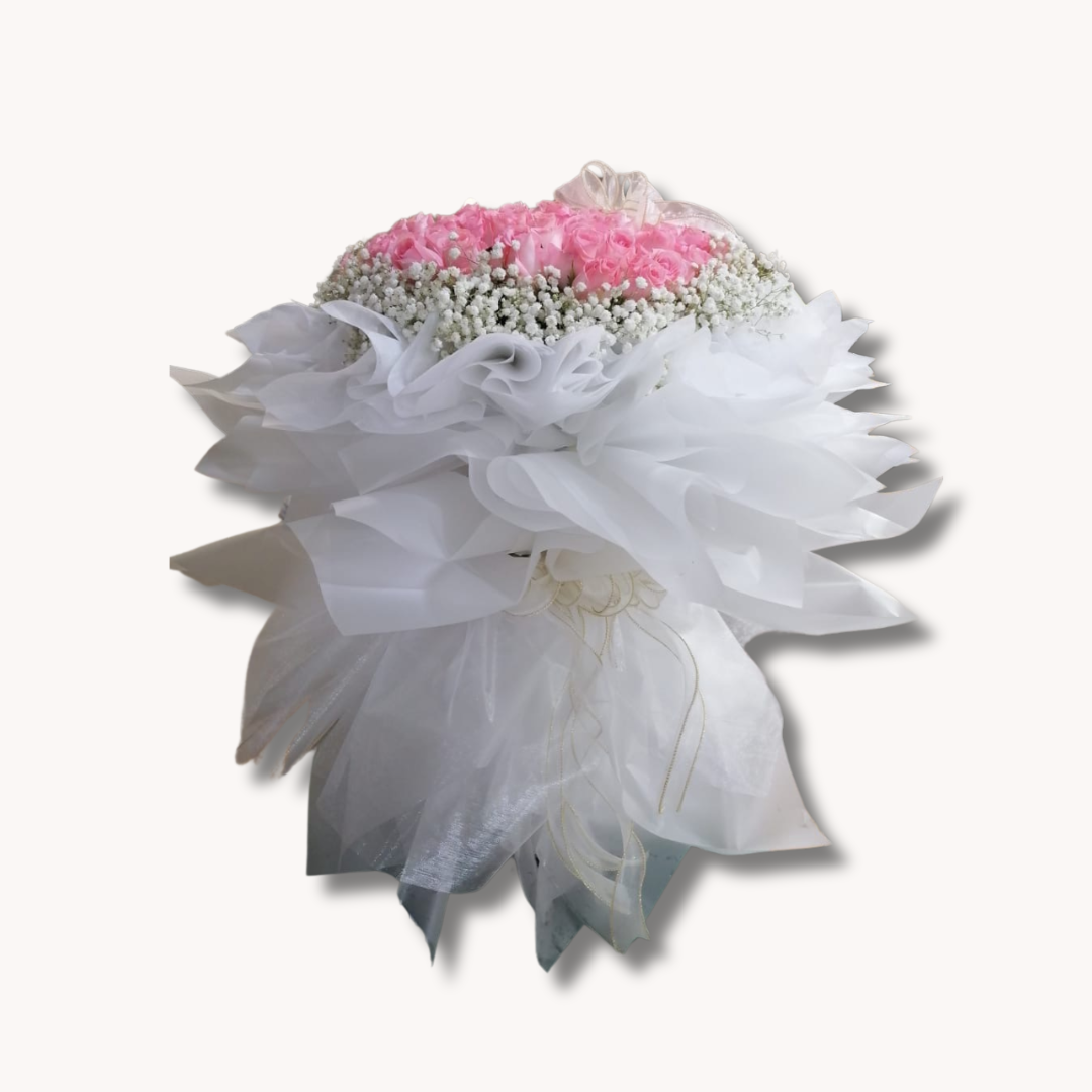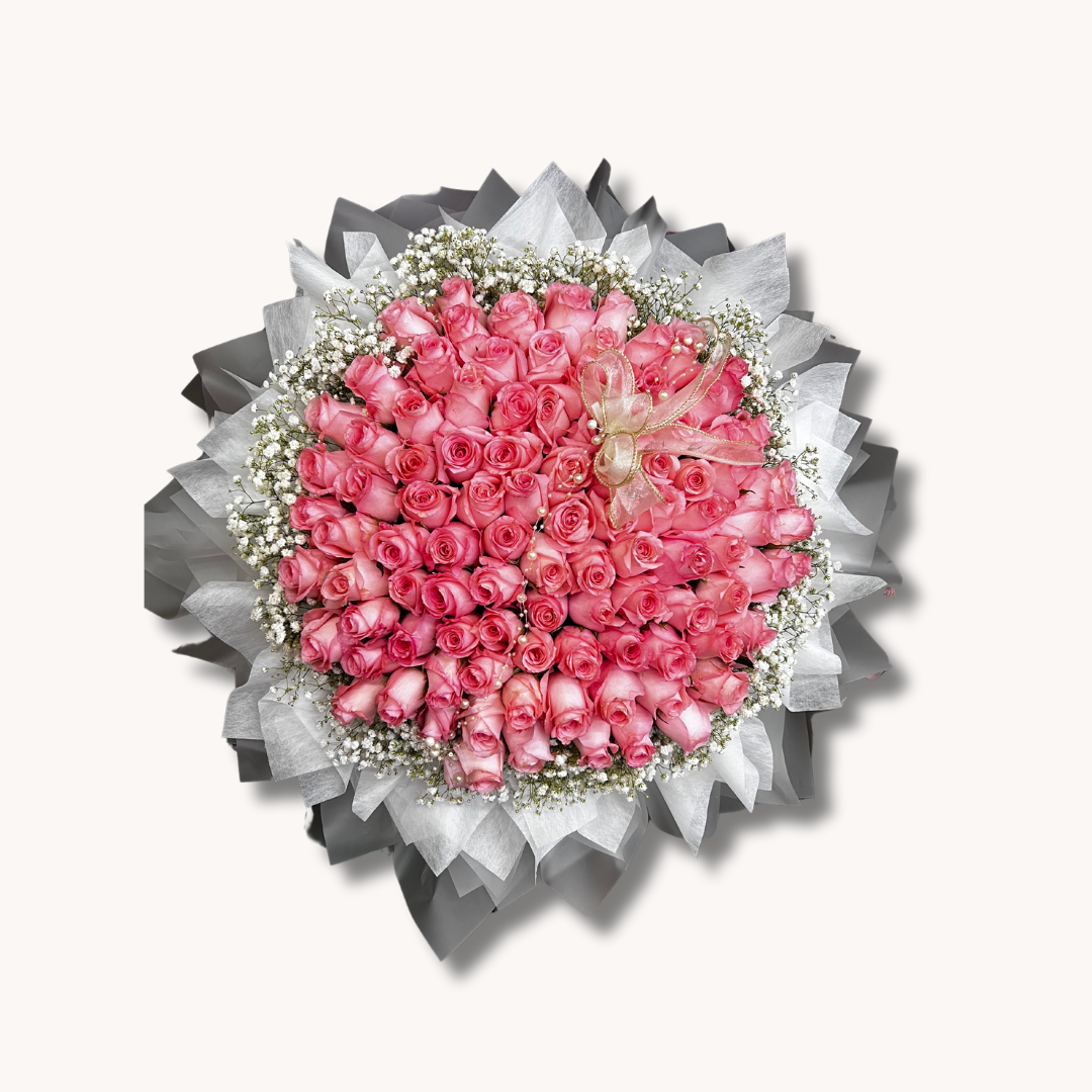 An enchanting 99 pink rose bouquet adorned with princess skirting, a regal and romantic arrangement fit for royalty, destined to charm and delight the recipient with its elegance and grace.