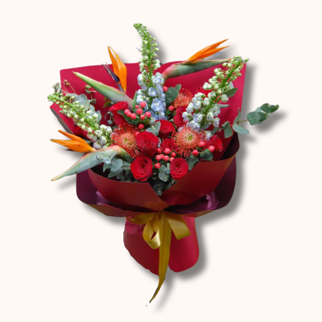 A captivating display of passion with our ruby red bouquet, elegantly encased in a matching crimson wrapper, adorned with luxurious red roses, majestic purple delphinium, exotic bird of paradise blooms, and vibrant hypericum berries, a radiant expression of love and sophistication.