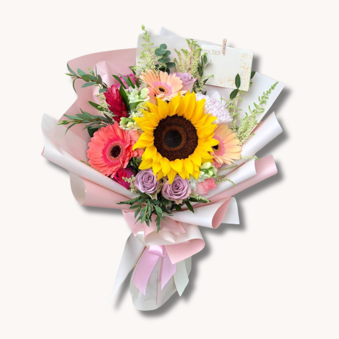 A radiant sunflower bouquet - a cheerful burst of golden blooms that brings warmth and joy to any setting, perfect for brightening someone's day or adding a touch of sunshine to any occasion.