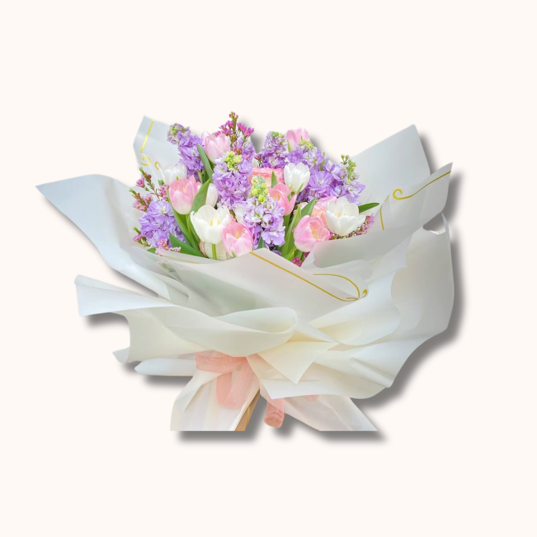Embrace the beauty of spring with our charming bouquet featuring white and pink tulips, accented by lush purple Matthiola, all elegantly presented in a crisp white wrapper for a touch of timeless sophistication.